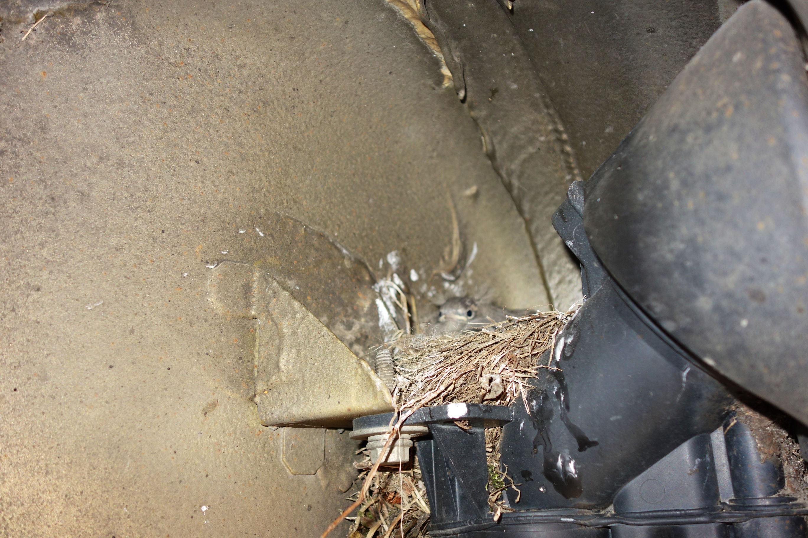 おかしいなと思ってクルマの下をのぞいてみると、タイヤハウスに鳥が巣を作って子育てを始めていました。
